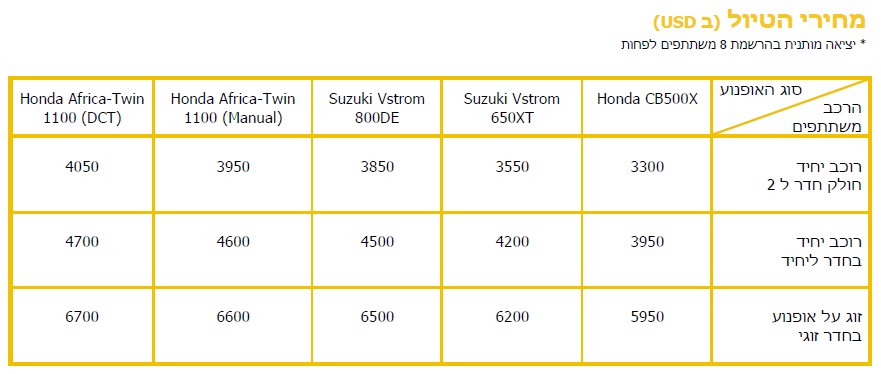 - השכרת אופנוע ל 8 ימים כולל ביטוח חובה וצד ג'