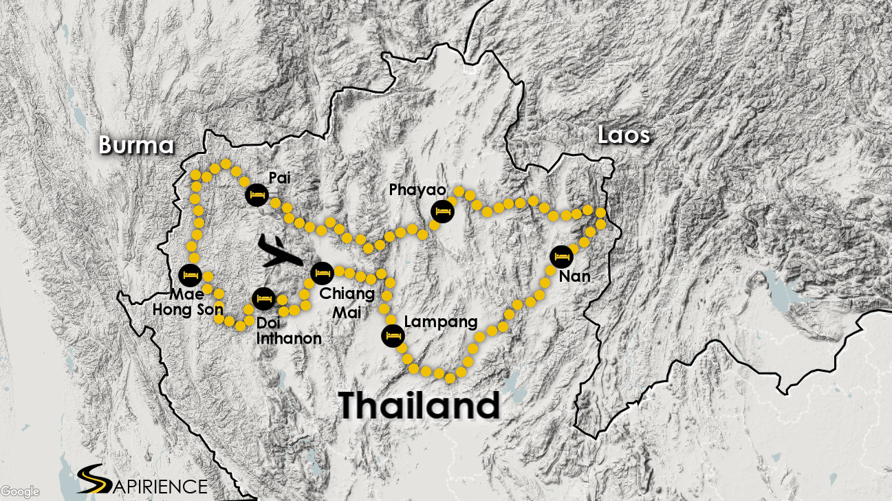 בטיול זה נצא מצ'יאנג מאי – בירת הצפון, אל אזורי הספר לאורך הגבולות הצפון מערביים של המדינה – עם בורמה ועם לאוס. נרכב בכבישים צדדיים המדגישים את כל מה שעדיין אותנטי, טבעי וכפרי, ואת המגוון האנושי והתרבותי המיוחד באזור זה… רגע לפני שהם משנים צביונם והופכים להיות תיירותיים יותר ומערביים יותר, כאזורים אחרים במדינה.